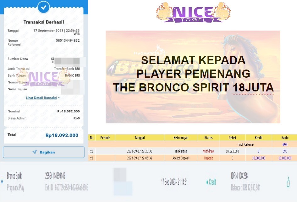 Selamat kepada User id : Mlc** Telah berhasil mendapatkan kemenangan besar pada permainan SLOT BRONCO SPIRIT  Dengan kemenangan Sebesar Rp.18.000.000,- Setelah mengisi formulir withdraw dengan kurung waktu hanya 5 – 10 menit pihak NICETOGEL sudah melakukan transfer kepada pemilik Userid dan dana sudah dapat di cairkan oleh pemenang. Bukti pembayaran yang kami berikan merupakan bukti pembayaran yang SAH / VALID yang langung di dapatkan melaui tanda transfer transaksi dari Bank yang di tuju.