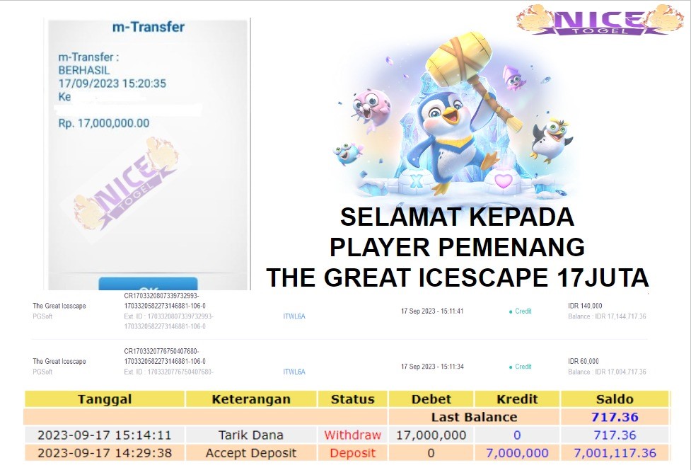 Selamat kepada User id : UHI** Telah berhasil mendapatkan kemenangan besar pada permainan SLOT GREAT ICESCAPE Dengan kemenangan Sebesar Rp.17.000.000,- Setelah mengisi formulir withdraw dengan kurung waktu hanya 5 – 10 menit pihak NICETOGEL sudah melakukan transfer kepada pemilik Userid dan dana sudah dapat di cairkan oleh pemenang. Bukti pembayaran yang kami berikan merupakan bukti pembayaran yang SAH / VALID yang langung di dapatkan melaui tanda transfer transaksi dari Bank yang di tuju.