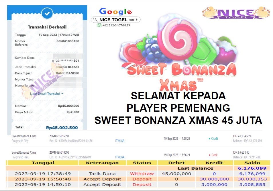 Selamat kepada User id : Lol** Telah berhasil mendapatkan kemenangan besar pada permainan SLOT SWEET BONANZA XMAS Dengan kemenangan Sebesar Rp.45.000.000,- Setelah mengisi formulir withdraw dengan kurung waktu hanya 5 – 10 menit pihak NICETOGEL sudah melakukan transfer kepada pemilik Userid dan dana sudah dapat di cairkan oleh pemenang. Bukti pembayaran yang kami berikan merupakan bukti pembayaran yang SAH / VALID yang langung di dapatkan melaui tanda transfer transaksi dari Bank yang di tuju.