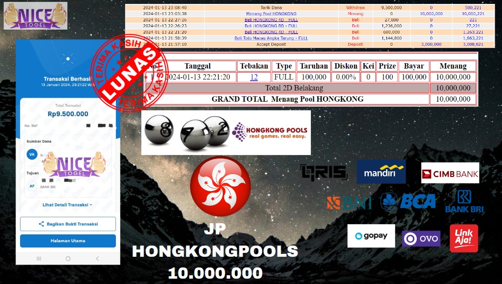 Selamat kepada User id : Ioi** Telah berhasil mendapatkan kemenangan besar pada permainan TOGEL HONGKONG Dengan kemenangan Sebesar Rp.10.000.000,- Setelah mengisi formulir withdraw dengan kurung waktu hanya 5 – 10 menit pihak NICETOGEL sudah melakukan transfer kepada pemilik Userid dan dana sudah dapat di cairkan oleh pemenang. Bukti pembayaran yang kami berikan merupakan bukti pembayaran yang SAH / VALID yang langung di dapatkan melaui tanda transfer transaksi dari Bank yang di tuju.