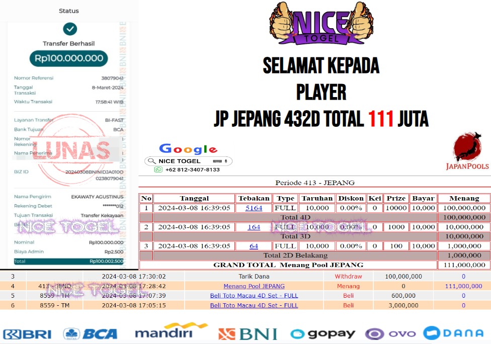 Selamat kepada User id : d** Telah berhasil mendapatkan kemenangan besar pada permainan TOGEL JEPANG Dengan kemenangan Sebesar Rp.111.000.000,- Setelah mengisi formulir withdraw dengan kurung waktu hanya 5 – 10 menit pihak NICETOGEL sudah melakukan transfer kepada pemilik Userid dan dana sudah dapat di cairkan oleh pemenang. Bukti pembayaran yang kami berikan merupakan bukti pembayaran yang SAH / VALID yang langung di dapatkan melaui tanda transfer transaksi dari Bank yang di tuju.