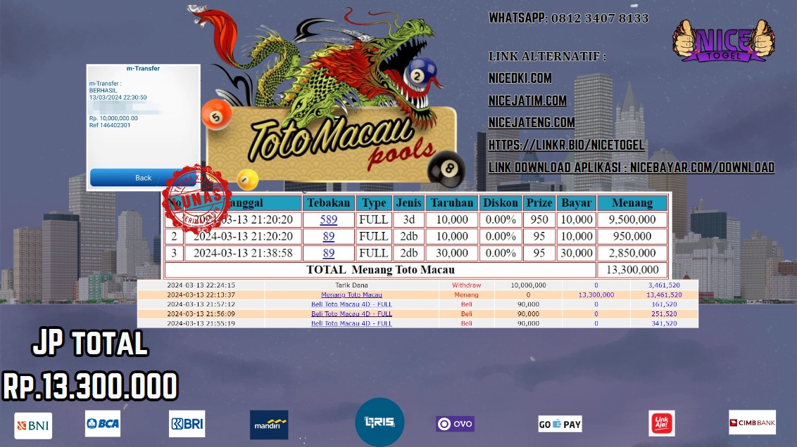 Selamat kepada User id : Ruc** Telah berhasil mendapatkan kemenangan besar pada permainan TOGEL TOTOMACAU Dengan kemenangan Sebesar Rp.13.300.000,- Setelah mengisi formulir withdraw dengan kurung waktu hanya 5 – 10 menit pihak NICETOGEL sudah melakukan transfer kepada pemilik Userid dan dana sudah dapat di cairkan oleh pemenang. Bukti pembayaran yang kami berikan merupakan bukti pembayaran yang SAH / VALID yang langung di dapatkan melaui tanda transfer transaksi dari Bank yang di tuju.