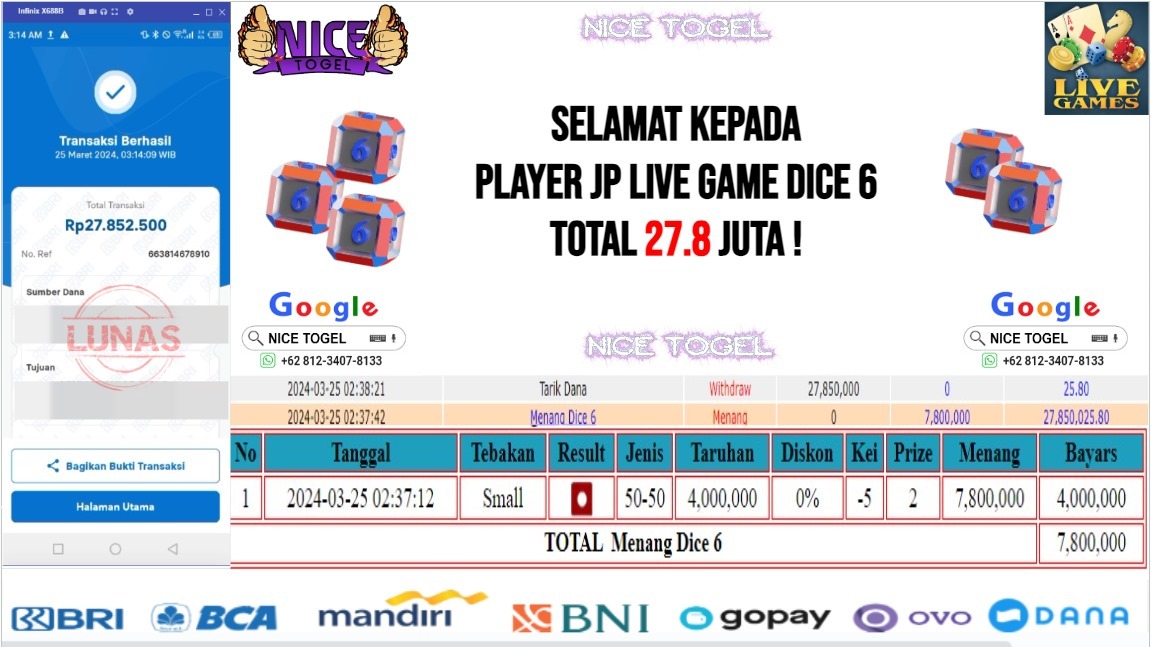 Selamat kepada User id : h** Telah berhasil mendapatkan kemenangan besar pada permainan DICE 6 GAMES Dengan kemenangan Sebesar Rp.27.800.000,- Setelah mengisi formulir withdraw dengan kurung waktu hanya 5 – 10 menit pihak NICETOGEL sudah melakukan transfer kepada pemilik Userid dan dana sudah dapat di cairkan oleh pemenang. Bukti pembayaran yang kami berikan merupakan bukti pembayaran yang SAH / VALID yang langung di dapatkan melaui tanda transfer transaksi dari Bank yang di tuju.