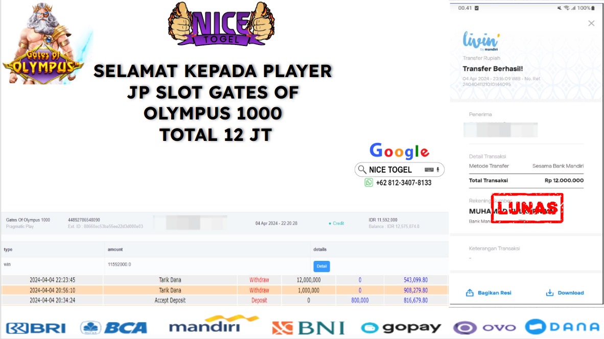 Selamat kepada User id : ass** Telah berhasil mendapatkan kemenangan besar pada permainan SLOT GATES OF OLYMPUS Dengan kemenangan Sebesar Rp.12.000.000,- Setelah mengisi formulir withdraw dengan kurung waktu hanya 5 – 10 menit pihak NICETOGEL sudah melakukan transfer kepada pemilik Userid dan dana sudah dapat di cairkan oleh pemenang. Bukti pembayaran yang kami berikan merupakan bukti pembayaran yang SAH / VALID yang langung di dapatkan melaui tanda transfer transaksi dari Bank yang di tuju.