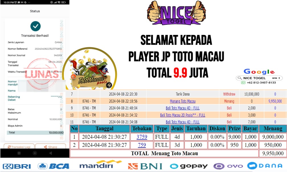 Selamat kepada User id : ah** Telah berhasil mendapatkan kemenangan besar pada permainan TOGEL TOTO MACAU Dengan kemenangan Sebesar Rp.9.900.000,- Setelah mengisi formulir withdraw dengan kurung waktu hanya 5 – 10 menit pihak NICETOGEL sudah melakukan transfer kepada pemilik Userid dan dana sudah dapat di cairkan oleh pemenang. Bukti pembayaran yang kami berikan merupakan bukti pembayaran yang SAH / VALID yang langung di dapatkan melaui tanda transfer transaksi dari Bank yang di tuju.