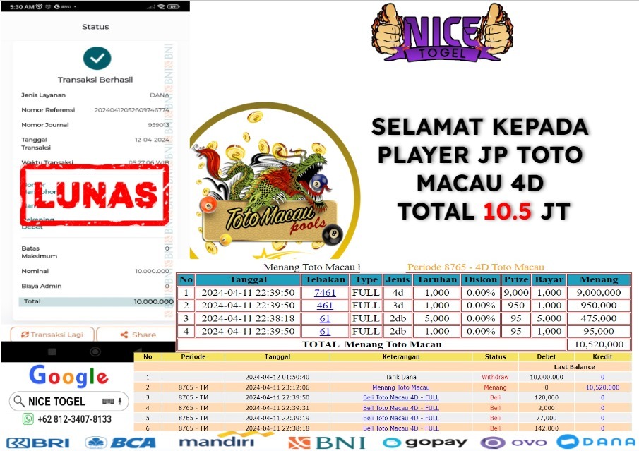 Selamat kepada User id : Lal*** Telah berhasil mendapatkan kemenangan besar pada permainan TOGEL TOTO MACAU Dengan kemenangan Sebesar Rp.10.500.000,- Setelah mengisi formulir withdraw dengan kurung waktu hanya 5 – 10 menit pihak NICETOGEL sudah melakukan transfer kepada pemilik Userid dan dana sudah dapat di cairkan oleh pemenang. Bukti pembayaran yang kami berikan merupakan bukti pembayaran yang SAH / VALID yang langung di dapatkan melaui tanda transfer transaksi dari Bank yang di tuju.
