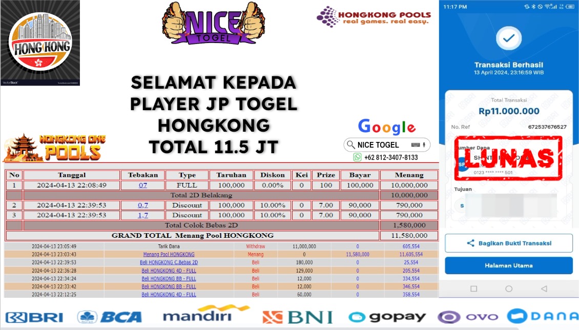 selamat kepada User id : han**** Telah berhasil mendapatkan kemenangan besar pada permainan TOGEL HONGKONG Dengan kemenangan Sebesar Rp.11.500.000,- Setelah mengisi formulir withdraw dengan kurung waktu hanya 5 – 10 menit pihak NICETOGEL sudah melakukan transfer kepada pemilik Userid dan dana sudah dapat di cairkan oleh pemenang. Bukti pembayaran yang kami berikan merupakan bukti pembayaran yang SAH / VALID yang langung di dapatkan melaui tanda transfer transaksi dari Bank yang di tuju.