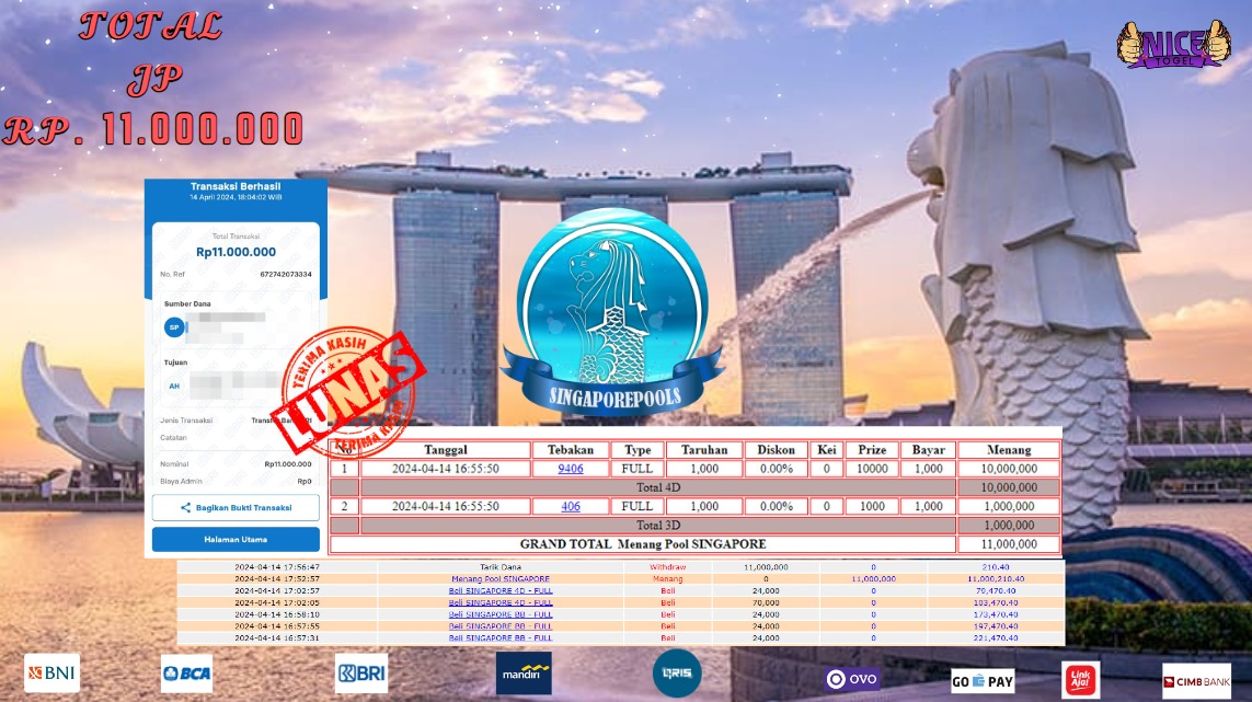 Selamat kepada User id : Cuc** Telah berhasil mendapatkan kemenangan besar pada permainan TOGEL SINGAPORE Dengan kemenangan Sebesar Rp.11.000.000,- Setelah mengisi formulir withdraw dengan kurung waktu hanya 5 – 10 menit pihak NICETOGEL sudah melakukan transfer kepada pemilik Userid dan dana sudah dapat di cairkan oleh pemenang. Bukti pembayaran yang kami berikan merupakan bukti pembayaran yang SAH / VALID yang langung di dapatkan melaui tanda transfer transaksi dari Bank yang di tuju.