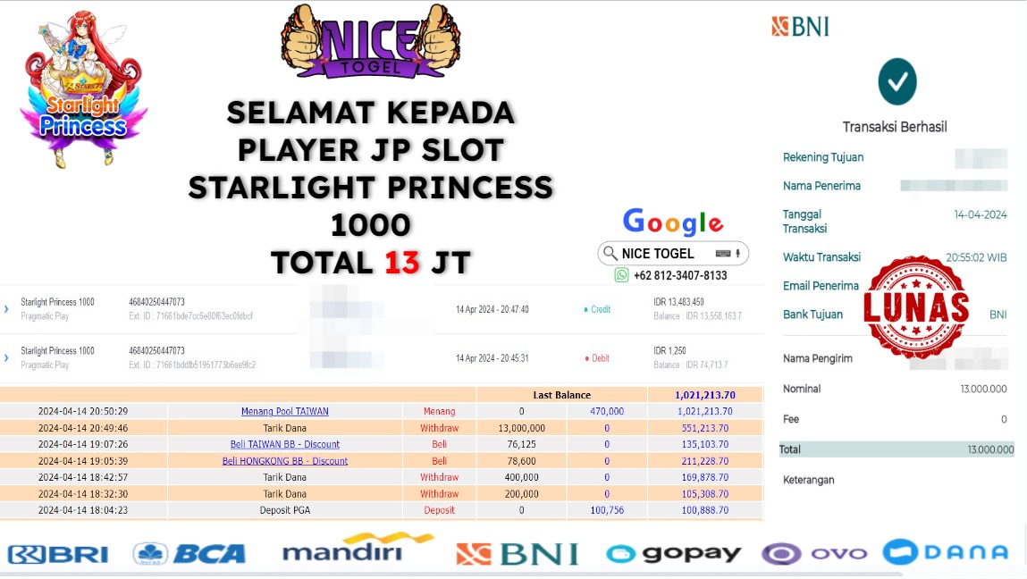 Selamat kepada User id : far**** Telah berhasil mendapatkan kemenangan besar pada permainan SLOT STARLIGHT PRINCESS Dengan kemenangan Sebesar Rp.13.000.000,- Setelah mengisi formulir withdraw dengan kurung waktu hanya 5 – 10 menit pihak NICETOGEL sudah melakukan transfer kepada pemilik Userid dan dana sudah dapat di cairkan oleh pemenang. Bukti pembayaran yang kami berikan merupakan bukti pembayaran yang SAH / VALID yang langung di dapatkan melaui tanda transfer transaksi dari Bank yang di tuju.