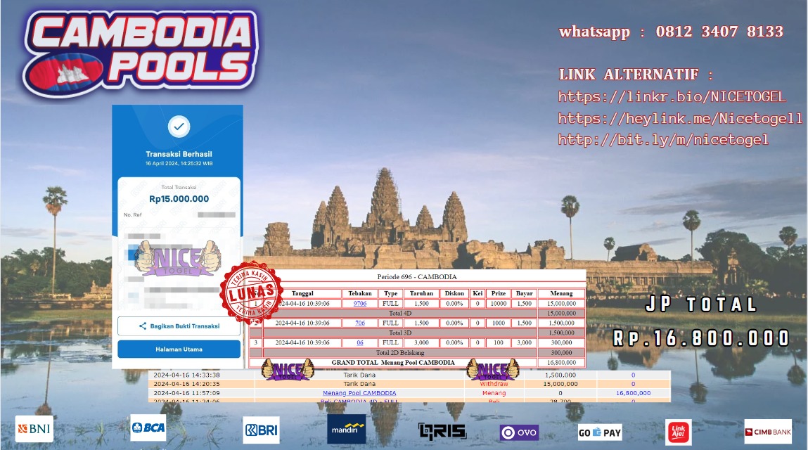 Selamat kepada User id : Feb** Telah berhasil mendapatkan kemenangan besar pada permainan TOGEL CAMBODIA Dengan kemenangan Sebesar Rp.16.800.000,- Setelah mengisi formulir withdraw dengan kurung waktu hanya 5 – 10 menit pihak NICETOGEL sudah melakukan transfer kepada pemilik Userid dan dana sudah dapat di cairkan oleh pemenang. Bukti pembayaran yang kami berikan merupakan bukti pembayaran yang SAH / VALID yang langung di dapatkan melaui tanda transfer transaksi dari Bank yang di tuju.