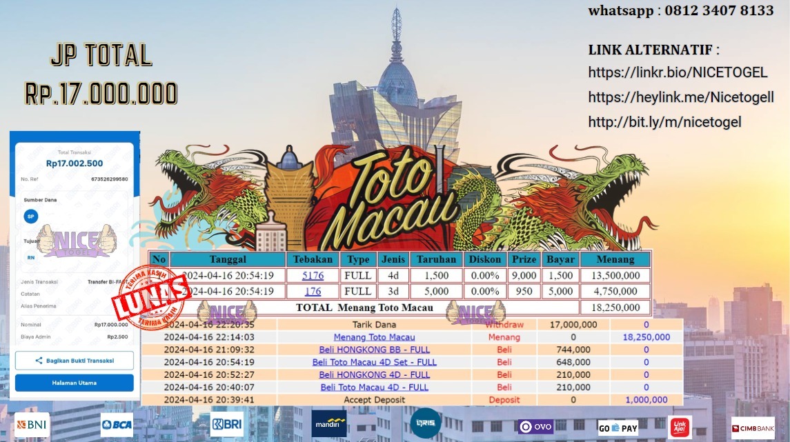Selamat kepada User id : Lok** Telah berhasil mendapatkan kemenangan besar pada permainan TOGEL TOTOMACAU Dengan kemenangan Sebesar Rp.17.000.000,- Setelah mengisi formulir withdraw dengan kurung waktu hanya 5 – 10 menit pihak NICETOGEL sudah melakukan transfer kepada pemilik Userid dan dana sudah dapat di cairkan oleh pemenang. Bukti pembayaran yang kami berikan merupakan bukti pembayaran yang SAH / VALID yang langung di dapatkan melaui tanda transfer transaksi dari Bank yang di tuju.