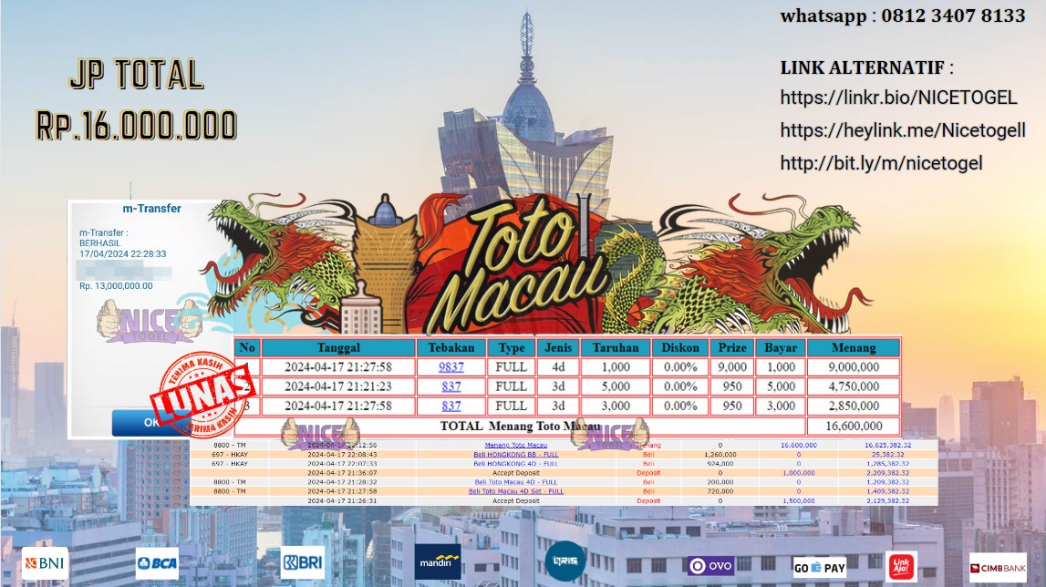 Selamat kepada User id : Jok** Telah berhasil mendapatkan kemenangan besar pada permainan TOGEL TOTOMACAU Dengan kemenangan Sebesar Rp.16.000.000,- Setelah mengisi formulir withdraw dengan kurung waktu hanya 5 – 10 menit pihak NICETOGEL sudah melakukan transfer kepada pemilik Userid dan dana sudah dapat di cairkan oleh pemenang. Bukti pembayaran yang kami berikan merupakan bukti pembayaran yang SAH / VALID yang langung di dapatkan melaui tanda transfer transaksi dari Bank yang di tuju.