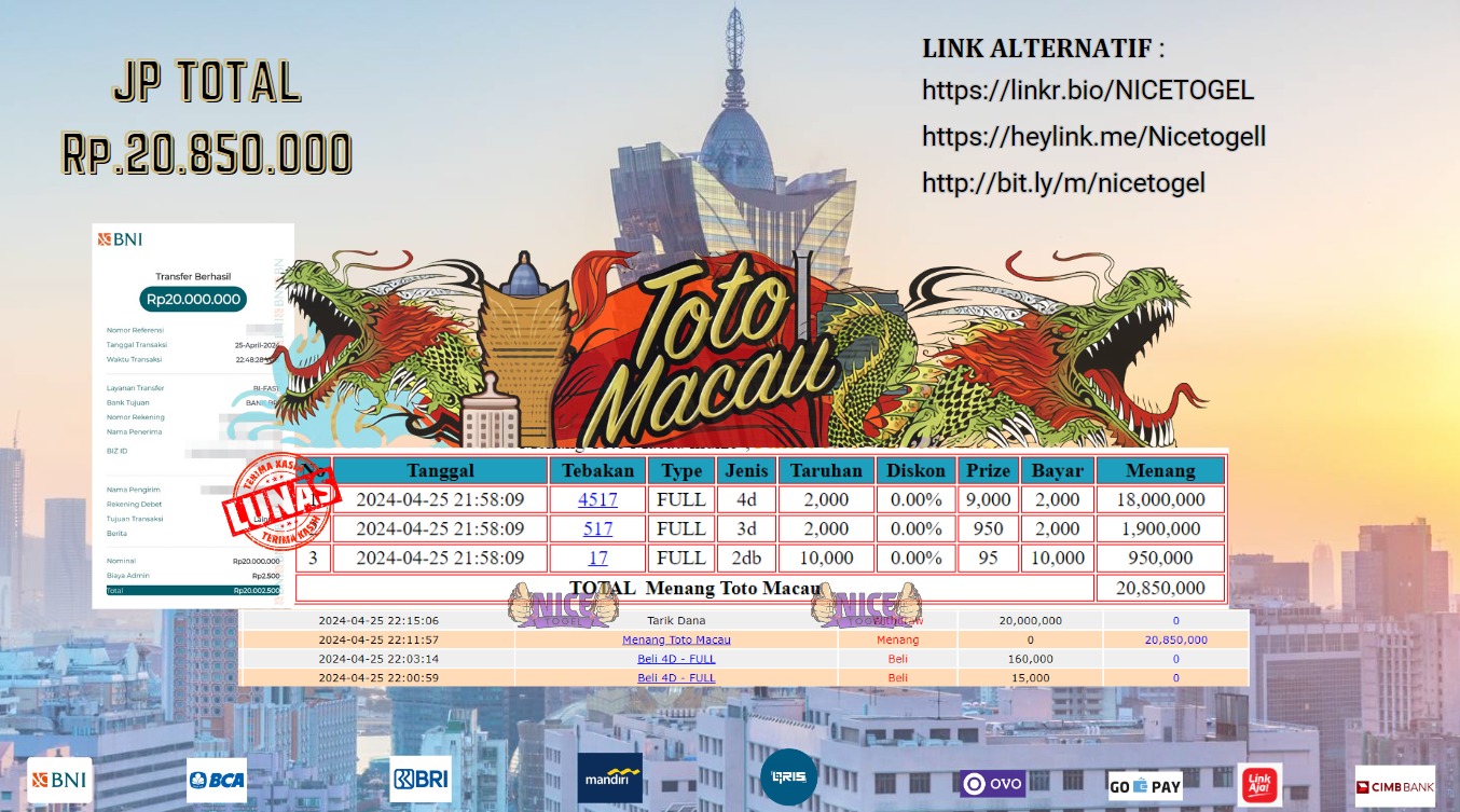 Selamat kepada User id : Ind** Telah berhasil mendapatkan kemenangan besar pada permainan TOGEL TOTOMACAU Dengan kemenangan Sebesar Rp.20.850.000,- Setelah mengisi formulir withdraw dengan kurung waktu hanya 5 – 10 menit pihak NICETOGEL sudah melakukan transfer kepada pemilik Userid dan dana sudah dapat di cairkan oleh pemenang. Bukti pembayaran yang kami berikan merupakan bukti pembayaran yang SAH / VALID yang langung di dapatkan melaui tanda transfer transaksi dari Bank yang di tuju.