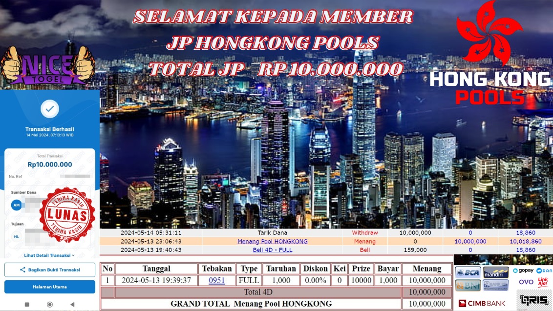 Selamat kepada User id : Ole***81 Telah berhasil mendapatkan kemenangan besar pada permainan TOGEL HONGKONG Dengan kemenangan Sebesar Rp.10.000.000,- Setelah mengisi formulir withdraw dengan kurung waktu hanya 5 – 10 menit pihak NICETOGEL sudah melakukan transfer kepada pemilik Userid dan dana sudah dapat di cairkan oleh pemenang. Bukti pembayaran yang kami berikan merupakan bukti pembayaran yang SAH / VALID yang langung di dapatkan melaui tanda transfer transaksi dari Bank yang di tuju.