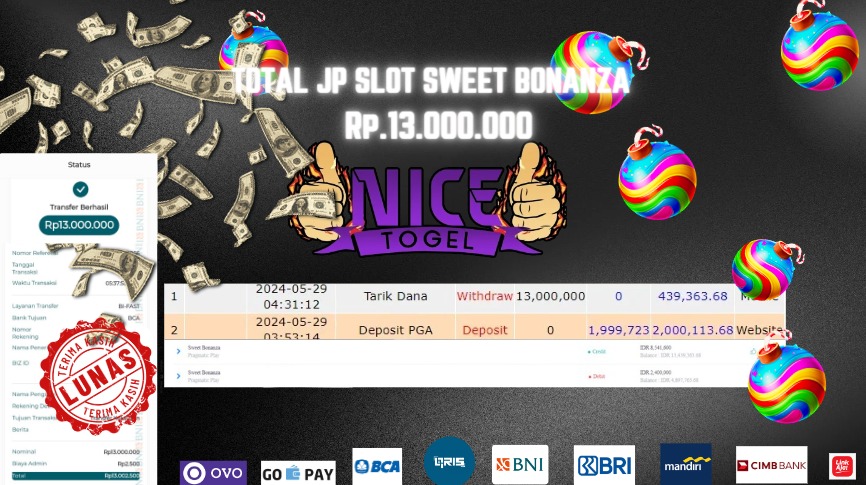 Selamat kepada User id : ra** Telah berhasil mendapatkan kemenangan besar pada permainan SLOT SWEET BONANZA Dengan kemenangan Sebesar Rp.13.000.000,- Setelah mengisi formulir withdraw dengan kurung waktu hanya 5 – 10 menit pihak NICETOGEL sudah melakukan transfer kepada pemilik Userid dan dana sudah dapat di cairkan oleh pemenang. Bukti pembayaran yang kami berikan merupakan bukti pembayaran yang SAH / VALID yang langung di dapatkan melaui tanda transfer transaksi dari Bank yang di tuju.