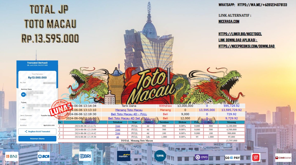 Selamat kepada User id : yanu** Telah berhasil mendapatkan kemenangan besar pada permainan TOGEL TOTO MACAU Dengan kemenangan Sebesar Rp.13.595.000,- Setelah mengisi formulir withdraw dengan kurung waktu hanya 5 – 10 menit pihak NICETOGEL sudah melakukan transfer kepada pemilik Userid dan dana sudah dapat di cairkan oleh pemenang. Bukti pembayaran yang kami berikan merupakan bukti pembayaran yang SAH / VALID yang langung di dapatkan melaui tanda transfer transaksi dari Bank yang di tuju.