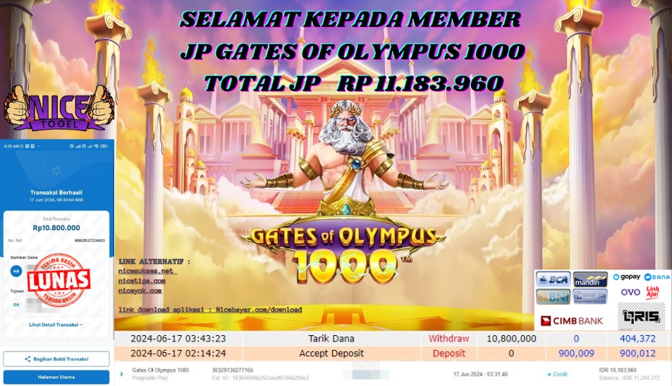 Selamat kepada User id : Max**7 Telah berhasil mendapatkan kemenangan besar pada permainan SLOT GATES OF OLYMPUS 1000 Dengan kemenangan Sebesar Rp. 10.183.960,- Setelah mengisi formulir withdraw dengan kurung waktu hanya 5 – 10 menit pihak NICETOGEL sudah melakukan transfer kepada pemilik Userid dan dana sudah dapat di cairkan oleh pemenang. Bukti pembayaran yang kami berikan merupakan bukti pembayaran yang SAH / VALID yang langung di dapatkan melaui tanda transfer transaksi dari Bank yang di tuju.