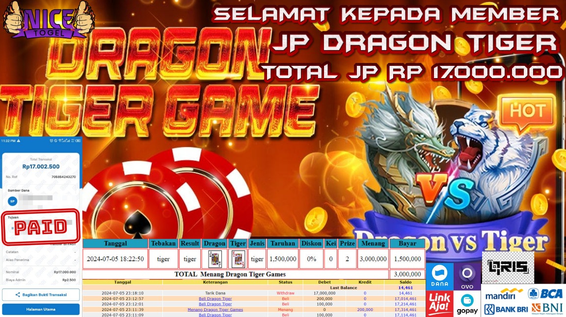 Selamat kepada User id : 9B*** Telah berhasil mendapatkan kemenangan besar pada permainan LIVE GAMES DRAGON TIGER Dengan kemenangan Sebesar Rp. 17.000.000,- Setelah mengisi formulir withdraw dengan kurung waktu hanya 5 – 10 menit pihak NICETOGEL sudah melakukan transfer kepada pemilik Userid dan dana sudah dapat di cairkan oleh pemenang. Bukti pembayaran yang kami berikan merupakan bukti pembayaran yang SAH / VALID yang langung di dapatkan melaui tanda transfer transaksi dari Bank yang di tuju.
