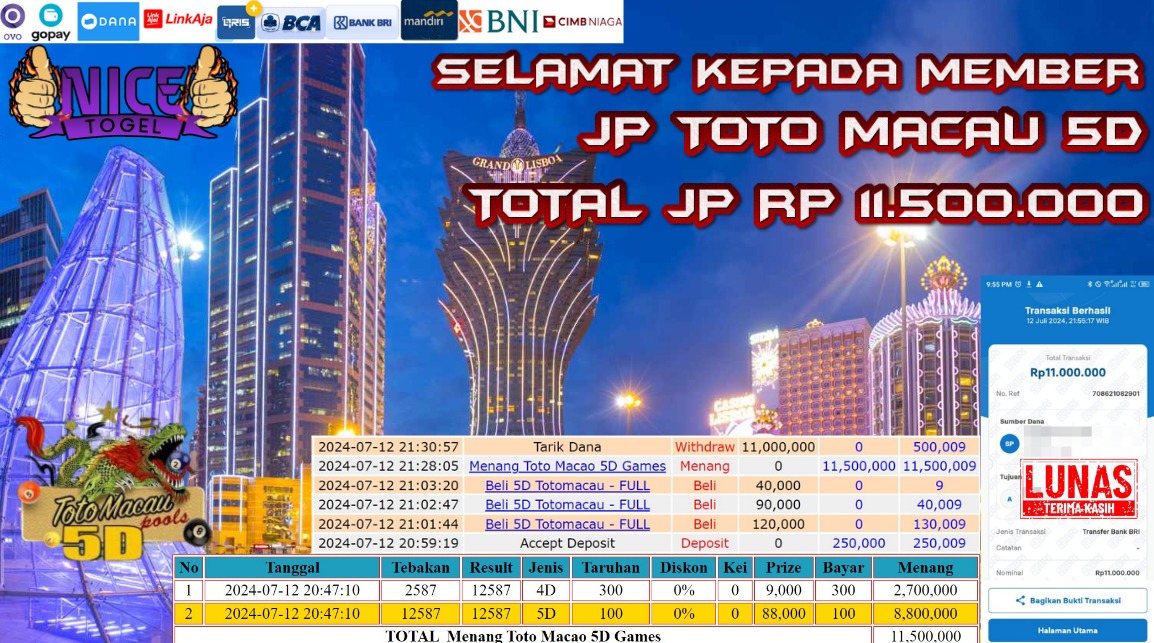 Selamat kepada User id : A***oi Telah berhasil mendapatkan kemenangan besar pada permainan TOGEL TOTO MACAU 5D POOLS Dengan kemenangan Sebesar Rp. 11.500.000,- Setelah mengisi formulir withdraw dengan kurung waktu hanya 5 – 10 menit pihak NICETOGEL sudah melakukan transfer kepada pemilik Userid dan dana sudah dapat di cairkan oleh pemenang. Bukti pembayaran yang kami berikan merupakan bukti pembayaran yang SAH / VALID yang langung di dapatkan melaui tanda transfer transaksi dari Bank yang di tuju.