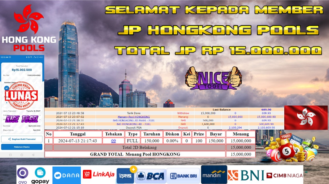 Selamat kepada User id : Sy**L Telah berhasil mendapatkan kemenangan besar pada permainan TOGEL HONGKONG POOLS Dengan kemenangan Sebesar Rp. 15.000.000,- Setelah mengisi formulir withdraw dengan kurung waktu hanya 5 – 10 menit pihak NICETOGEL sudah melakukan transfer kepada pemilik Userid dan dana sudah dapat di cairkan oleh pemenang. Bukti pembayaran yang kami berikan merupakan bukti pembayaran yang SAH / VALID yang langung di dapatkan melaui tanda transfer transaksi dari Bank yang di tuju.