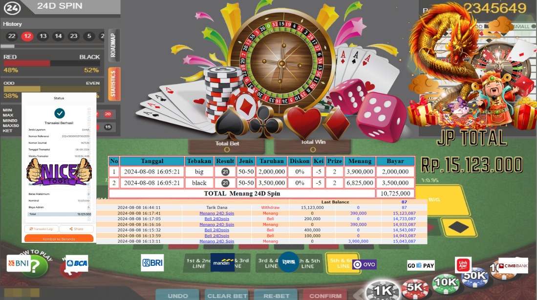 Selamat kepada User id : Kepl** Telah berhasil mendapatkan kemenangan besar pada permainan LIVEGAME 24D SPIN Dengan kemenangan Sebesar Rp.15.123.000,- Setelah mengisi formulir withdraw dengan kurung waktu hanya 5 – 10 menit pihak NICETOGEL sudah melakukan transfer kepada pemilik Userid dan dana sudah dapat di cairkan oleh pemenang. Bukti pembayaran yang kami berikan merupakan bukti pembayaran yang SAH / VALID yang langung di dapatkan melaui tanda transfer transaksi dari Bank yang di tuju.