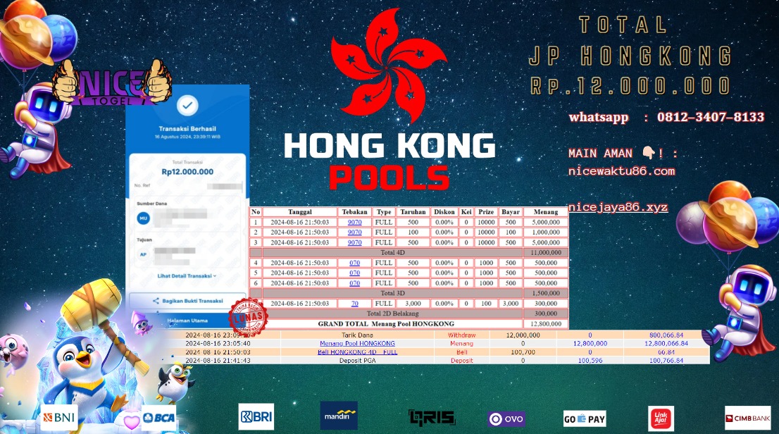 Selamat kepada User id : Lopea** Telah berhasil mendapatkan kemenangan besar pada permainan TOGEL HONGKONG Dengan kemenangan Sebesar Rp.12.000.000,- Setelah mengisi formulir withdraw dengan kurung waktu hanya 5 – 10 menit pihak NICETOGEL sudah melakukan transfer kepada pemilik Userid dan dana sudah dapat di cairkan oleh pemenang. Bukti pembayaran yang kami berikan merupakan bukti pembayaran yang SAH / VALID yang langung di dapatkan melaui tanda transfer transaksi dari Bank yang di tuju.