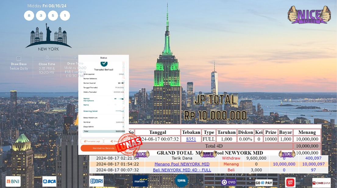 Selamat kepada User id : Aerk** Telah berhasil mendapatkan kemenangan besar pada permainanTOGEL NEWYORK MID  Dengan kemenangan Sebesar Rp.10.000.000,- Setelah mengisi formulir withdraw dengan kurung waktu hanya 5 – 10 menit pihak NICETOGEL sudah melakukan transfer kepada pemilik Userid dan dana sudah dapat di cairkan oleh pemenang. Bukti pembayaran yang kami berikan merupakan bukti pembayaran yang SAH / VALID yang langung di dapatkan melaui tanda transfer transaksi dari Bank yang di tuju.