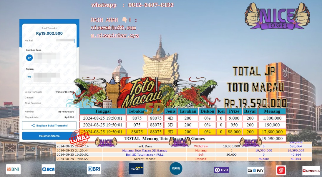 Selamat kepada User id : Tui** Telah berhasil mendapatkan kemenangan besar pada permainan TOTO MACAU 5D Dengan kemenangan Sebesar Rp.19.590.000,- Setelah mengisi formulir withdraw dengan kurung waktu hanya 5 – 10 menit pihak NICETOGEL sudah melakukan transfer kepada pemilik Userid dan dana sudah dapat di cairkan oleh pemenang. Bukti pembayaran yang kami berikan merupakan bukti pembayaran yang SAH / VALID yang langung di dapatkan melaui tanda transfer transaksi dari Bank yang di tuju.