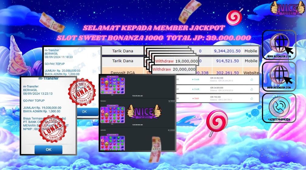 Selamat kepada User id : dabd**** Telah berhasil mendapatkan kemenangan besar pada permainan SLOT SWEET BONANZA 1000 Dengan kemenangan Sebesar Rp.39.000.000,- Setelah mengisi formulir withdraw dengan kurung waktu hanya 5 – 10 menit pihak NICETOGEL sudah melakukan transfer kepada pemilik Userid dan dana sudah dapat di cairkan oleh pemenang. Bukti pembayaran yang kami berikan merupakan bukti pembayaran yang SAH / VALID yang langung di dapatkan melaui tanda transfer transaksi dari Bank yang di tuju.