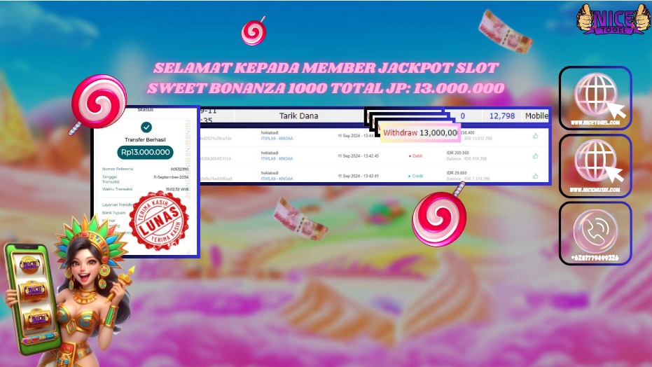 Selamat kepada User id : hok**** Telah berhasil mendapatkan kemenangan besar pada permainan SLOT SWEET BONANZA 1000 Dengan kemenangan Sebesar Rp.13.000.000,- Setelah mengisi formulir withdraw dengan kurung waktu hanya 5 – 10 menit pihak NICETOGEL sudah melakukan transfer kepada pemilik Userid dan dana sudah dapat di cairkan oleh pemenang. Bukti pembayaran yang kami berikan merupakan bukti pembayaran yang SAH / VALID yang langung di dapatkan melaui tanda transfer transaksi dari Bank yang di tuju.