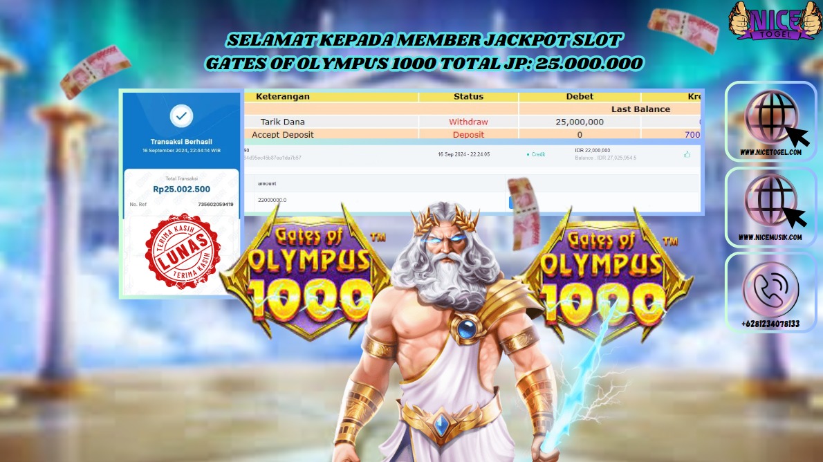 Selamat kepada User id : san** Telah berhasil mendapatkan kemenangan besar pada permainan SLOT GATES OF OLYMPUS 1000  Dengan kemenangan Sebesar Rp25.000.000,- Setelah mengisi formulir withdraw dengan kurung waktu hanya 5 – 10 menit pihak NICETOGEL sudah melakukan transfer kepada pemilik Userid dan dana sudah dapat di cairkan oleh pemenang. Bukti pembayaran yang kami berikan merupakan bukti pembayaran yang SAH / VALID yang langung di dapatkan melaui tanda transfer transaksi dari Bank yang di tuju.