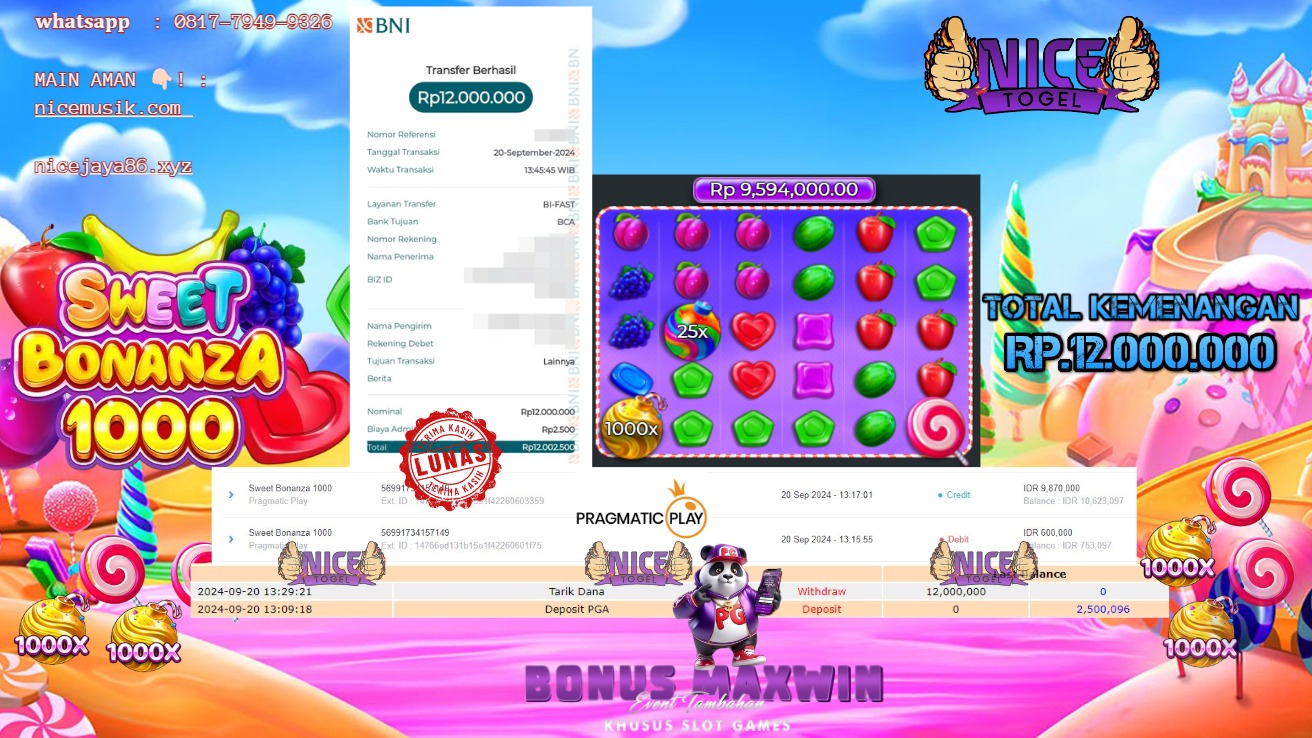 Selamat kepada User id : hokia** Telah berhasil mendapatkan kemenangan besar pada permainan SLOT SWEET BONANZA 1000 Dengan kemenangan Sebesar Rp.12.000.000,- Setelah mengisi formulir withdraw dengan kurung waktu hanya 5 – 10 menit pihak NICETOGEL sudah melakukan transfer kepada pemilik Userid dan dana sudah dapat di cairkan oleh pemenang. Bukti pembayaran yang kami berikan merupakan bukti pembayaran yang SAH / VALID yang langung di dapatkan melaui tanda transfer transaksi dari Bank yang di tuju.