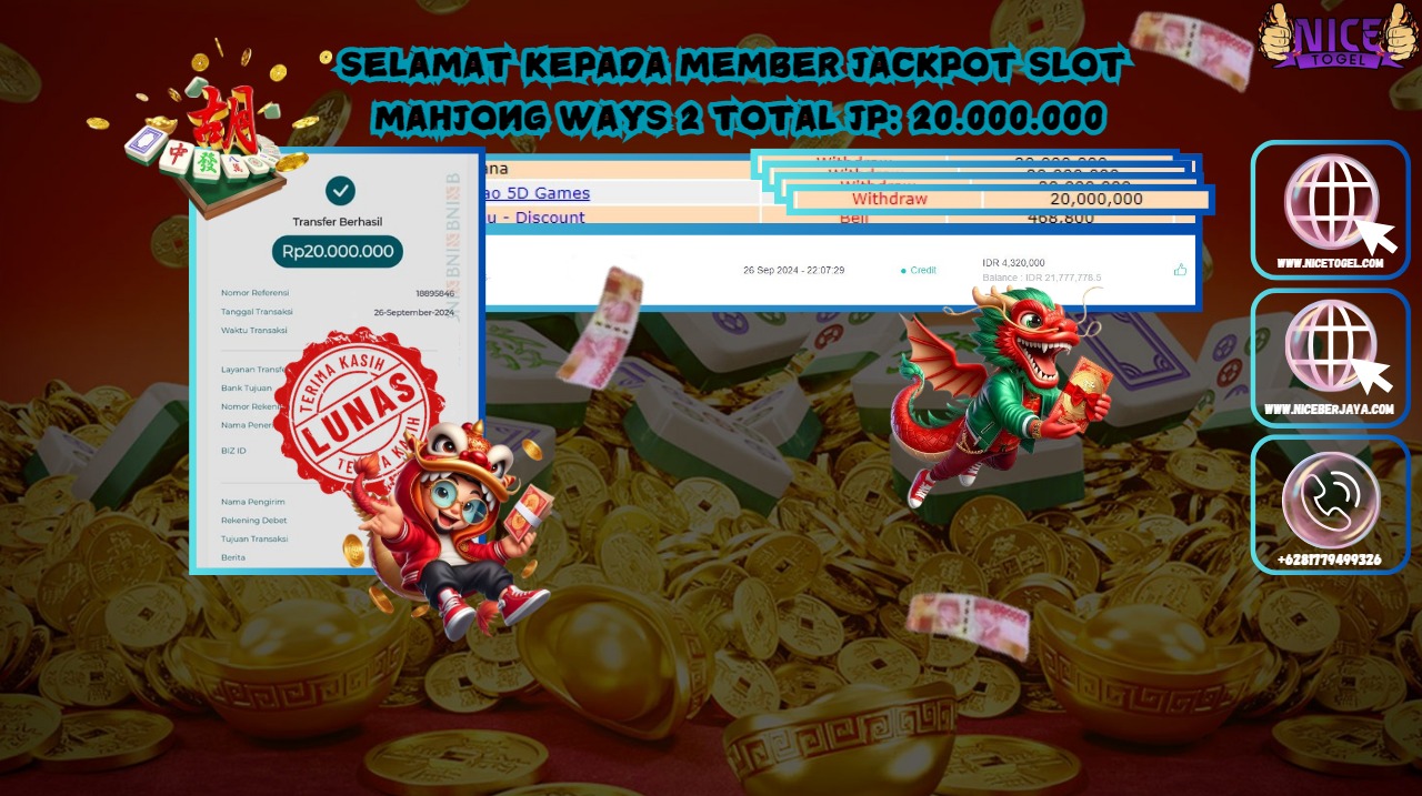 Selamat kepada User id : ers** Telah berhasil mendapatkan kemenangan besar pada permainan SLOT MAHYONG WAYS 2 Dengan kemenangan Sebesar Rp.20.000.000,- Setelah mengisi formulir withdraw dengan kurung waktu hanya 5 – 10 menit pihak NICETOGEL sudah melakukan transfer kepada pemilik Userid dan dana sudah dapat di cairkan oleh pemenang. Bukti pembayaran yang kami berikan merupakan bukti pembayaran yang SAH / VALID yang langung di dapatkan melaui tanda transfer transaksi dari Bank yang di tuju.