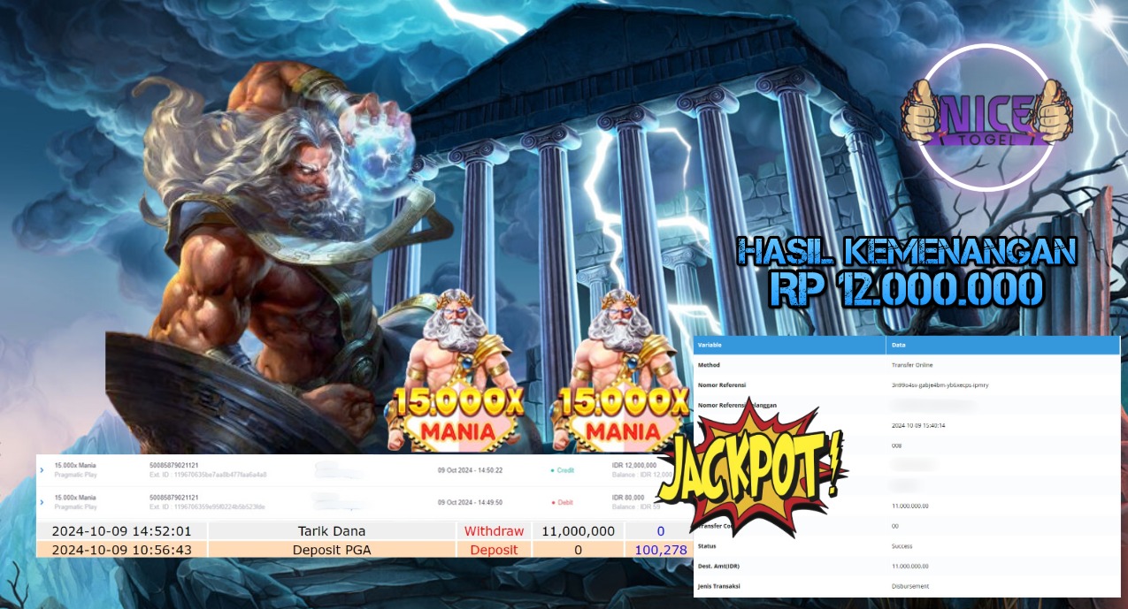 Selamat kepada User id : Yaki*** Telah berhasil mendapatkan kemenangan besar pada permainan SLOT 15.000X MANIA Dengan kemenangan Sebesar Rp.12.000.000,- Setelah mengisi formulir withdraw dengan kurung waktu hanya 5 – 10 menit pihak NICETOGEL sudah melakukan transfer kepada pemilik Userid dan dana sudah dapat di cairkan oleh pemenang. Bukti pembayaran yang kami berikan merupakan bukti pembayaran yang SAH / VALID yang langung di dapatkan melaui tanda transfer transaksi dari Bank yang di tuju.
