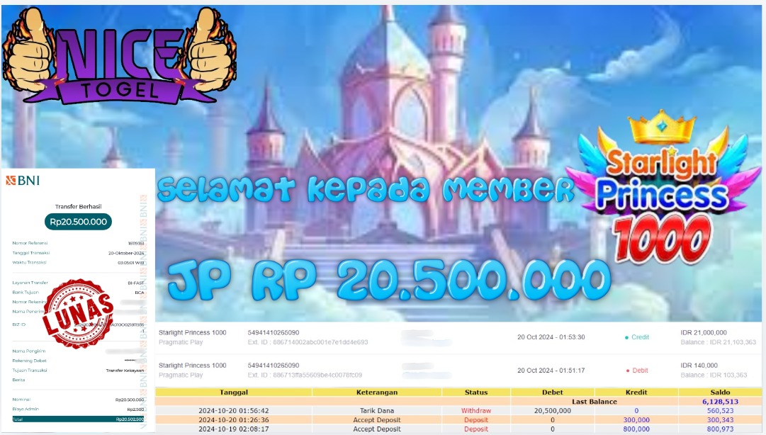 Selamat kepada User id : sot*** Telah berhasil mendapatkan kemenangan besar pada permainan SLOT STAR PRINCES.1000 Dengan kemenangan Sebesar Rp.20.500.000,- Setelah mengisi formulir withdraw dengan kurung waktu hanya 5 – 10 menit pihak NICETOGEL sudah melakukan transfer kepada pemilik Userid dan dana sudah dapat di cairkan oleh pemenang. Bukti pembayaran yang kami berikan merupakan bukti pembayaran yang SAH / VALID yang langung di dapatkan melaui tanda transfer transaksi dari Bank yang di tuju.
