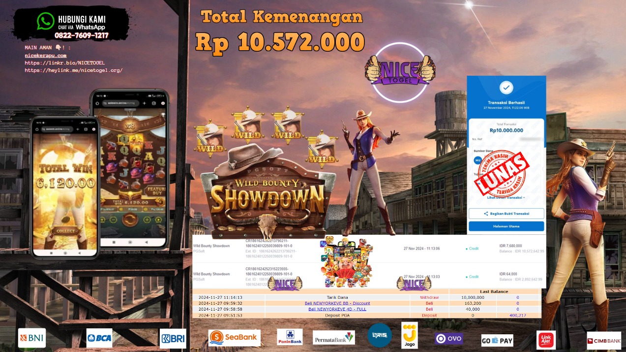 Selamat kepada User id : Ger52*** Telah berhasil mendapatkan kemenangan besar pada permainan SLOT WILD BOUNTY SHOWDOWN Dengan kemenangan Sebesar Rp.10.572.000,- Setelah mengisi formulir withdraw dengan kurung waktu hanya 5 – 10 menit pihak NICETOGEL sudah melakukan transfer kepada pemilik Userid dan dana sudah dapat di cairkan oleh pemenang. Bukti pembayaran yang kami berikan merupakan bukti pembayaran yang SAH / VALID yang langung di dapatkan melaui tanda transfer transaksi dari Bank yang di tuju.