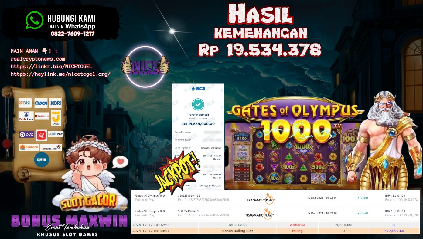 Selamat kepada User id : KEOP567*** Telah berhasil mendapatkan kemenangan besar pada permainan GATES OF OLYMPUS 1000 Dengan kemenangan Sebesar Rp.19.534.378,- Setelah mengisi formulir withdraw dengan kurung waktu hanya 5 – 10 menit pihak NICETOGEL sudah melakukan transfer kepada pemilik Userid dan dana sudah dapat di cairkan oleh pemenang. Bukti pembayaran yang kami berikan merupakan bukti pembayaran yang SAH / VALID yang langung di dapatkan melaui tanda transfer transaksi dari Bank yang di tuju.