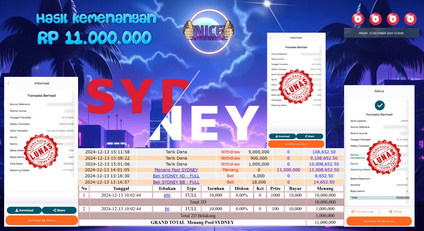 Selamat kepada User id : Jeryt8*** Telah berhasil mendapatkan kemenangan besar pada permainan TOGEL SYDNEY LOTTO Dengan kemenangan Sebesar Rp.11.000.000,- Setelah mengisi formulir withdraw dengan kurung waktu hanya 5 – 10 menit pihak NICETOGEL sudah melakukan transfer kepada pemilik Userid dan dana sudah dapat di cairkan oleh pemenang. Bukti pembayaran yang kami berikan merupakan bukti pembayaran yang SAH / VALID yang langung di dapatkan melaui tanda transfer transaksi dari Bank yang di tuju.