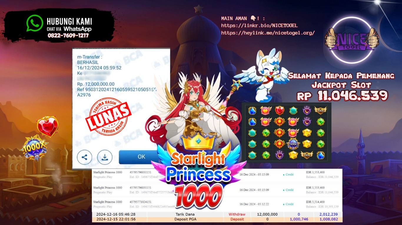 Selamat kepada User id : gus** Telah berhasil mendapatkan kemenangan besar pada permainan SLOT STARLIGHT PRINCESS 1000 Dengan kemenangan Sebesar Rp.11.046.539,- Setelah mengisi formulir withdraw dengan kurung waktu hanya 5 – 10 menit pihak NICETOGEL sudah melakukan transfer kepada pemilik Userid dan dana sudah dapat di cairkan oleh pemenang. Bukti pembayaran yang kami berikan merupakan bukti pembayaran yang SAH / VALID yang langung di dapatkan melaui tanda transfer transaksi dari Bank yang di tuju.