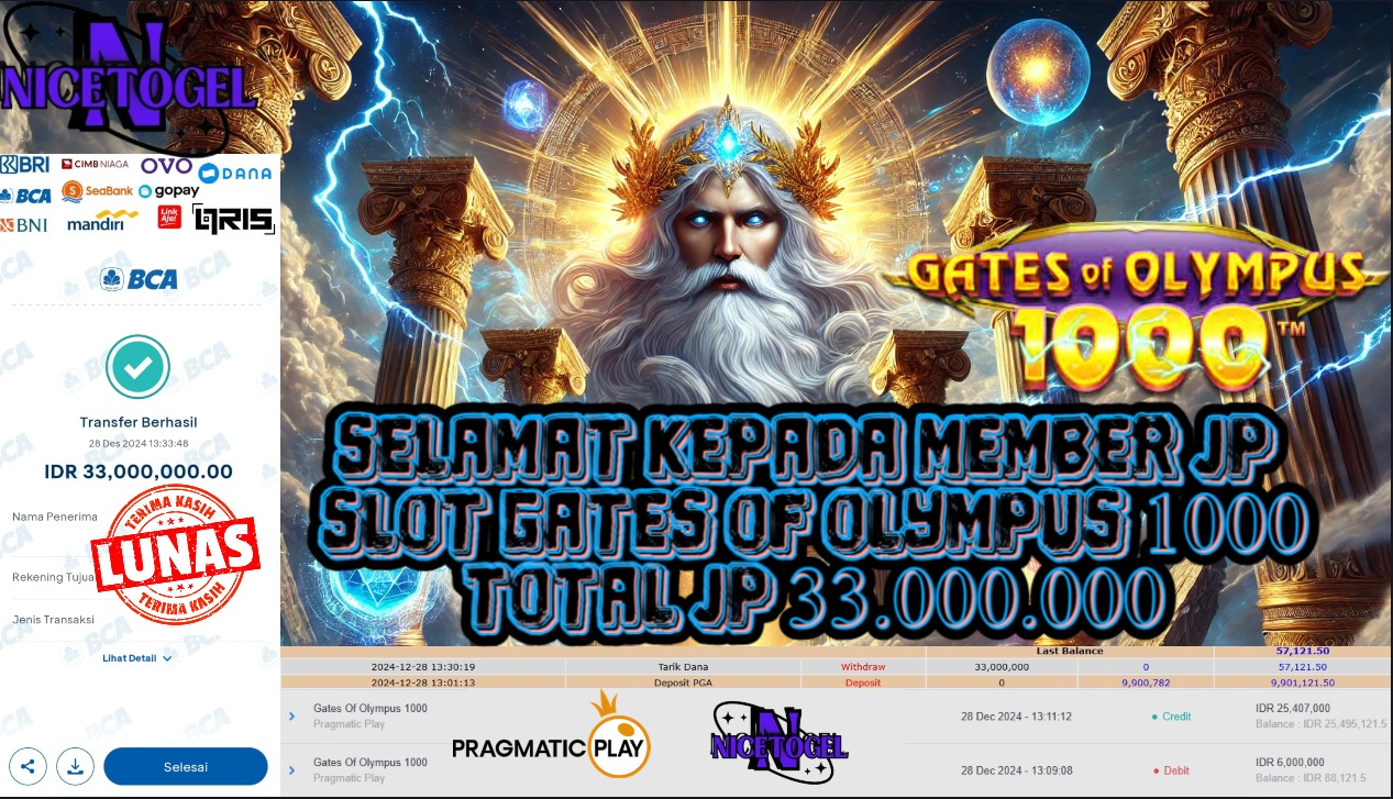 Selamat kepada User id : mat** Telah berhasil mendapatkan kemenangan besar pada permainan SLOT GATES OF OLYMPUS 1000  Dengan kemenangan Sebesar Rp.33.000.000,- Setelah mengisi formulir withdraw dengan kurung waktu hanya 5 – 10 menit pihak NICETOGEL sudah melakukan transfer kepada pemilik Userid dan dana sudah dapat di cairkan oleh pemenang. Bukti pembayaran yang kami berikan merupakan bukti pembayaran yang SAH / VALID yang langung di dapatkan melaui tanda transfer transaksi dari Bank yang di tuju.