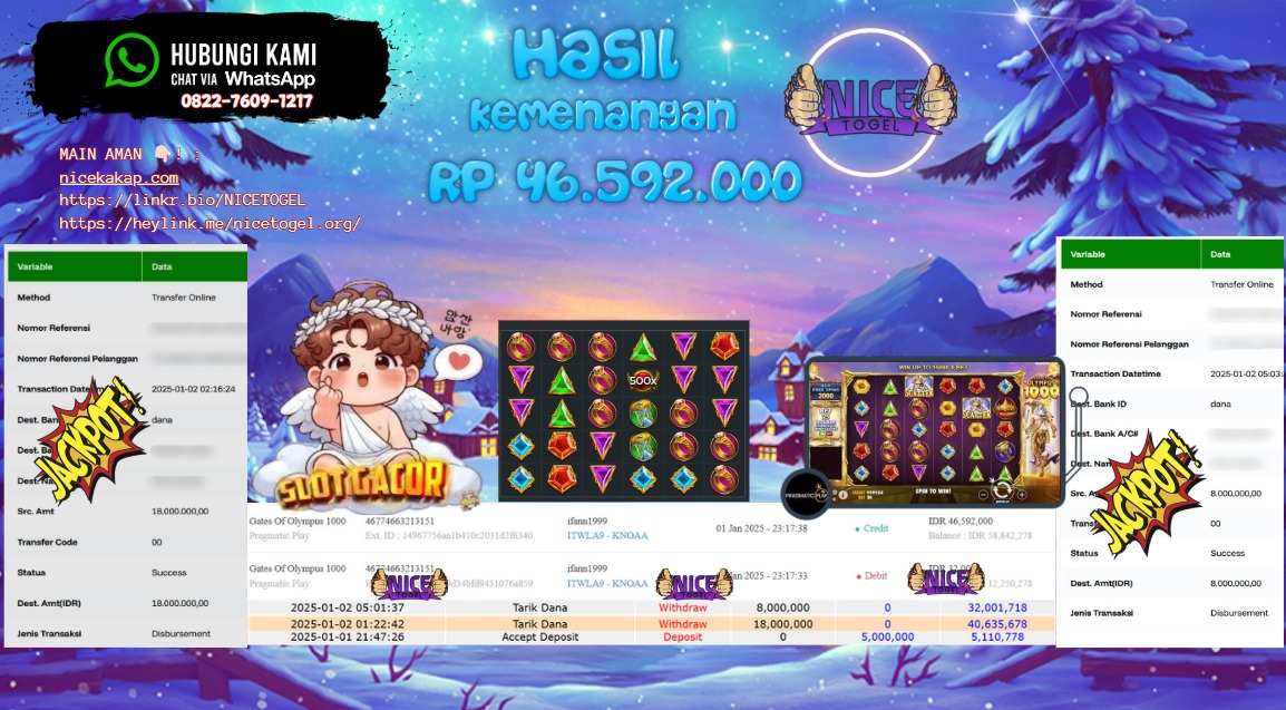 Selamat kepada User id : ifan** Telah berhasil mendapatkan kemenangan besar pada permainan SLOT GATES OF OLYMPUS 1000  Dengan kemenangan Sebesar Rp.46.592.000,- Setelah mengisi formulir withdraw dengan kurung waktu hanya 5 – 10 menit pihak NICETOGEL sudah melakukan transfer kepada pemilik Userid dan dana sudah dapat di cairkan oleh pemenang. Bukti pembayaran yang kami berikan merupakan bukti pembayaran yang SAH / VALID yang langung di dapatkan melaui tanda transfer transaksi dari Bank yang di tuju.