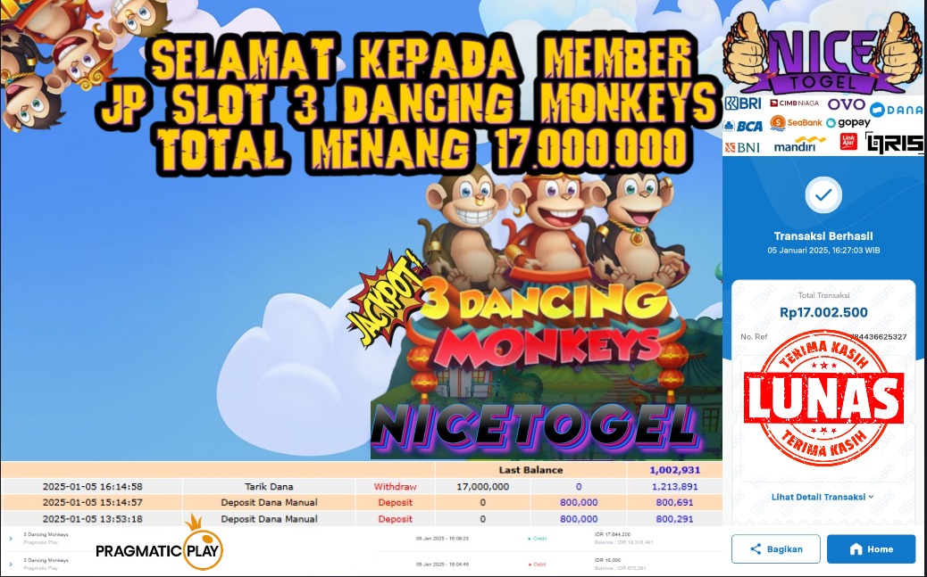 Selamat kepada User id : atr1** Telah berhasil mendapatkan kemenangan besar pada permainan SLOT 3 DANCING MONKEYS Dengan kemenangan Sebesar Rp.17.000.000,- Setelah mengisi formulir withdraw dengan kurung waktu hanya 5 – 10 menit pihak NICETOGEL sudah melakukan transfer kepada pemilik Userid dan dana sudah dapat di cairkan oleh pemenang. Bukti pembayaran yang kami berikan merupakan bukti pembayaran yang SAH / VALID yang langung di dapatkan melaui tanda transfer transaksi dari Bank yang di tuju.