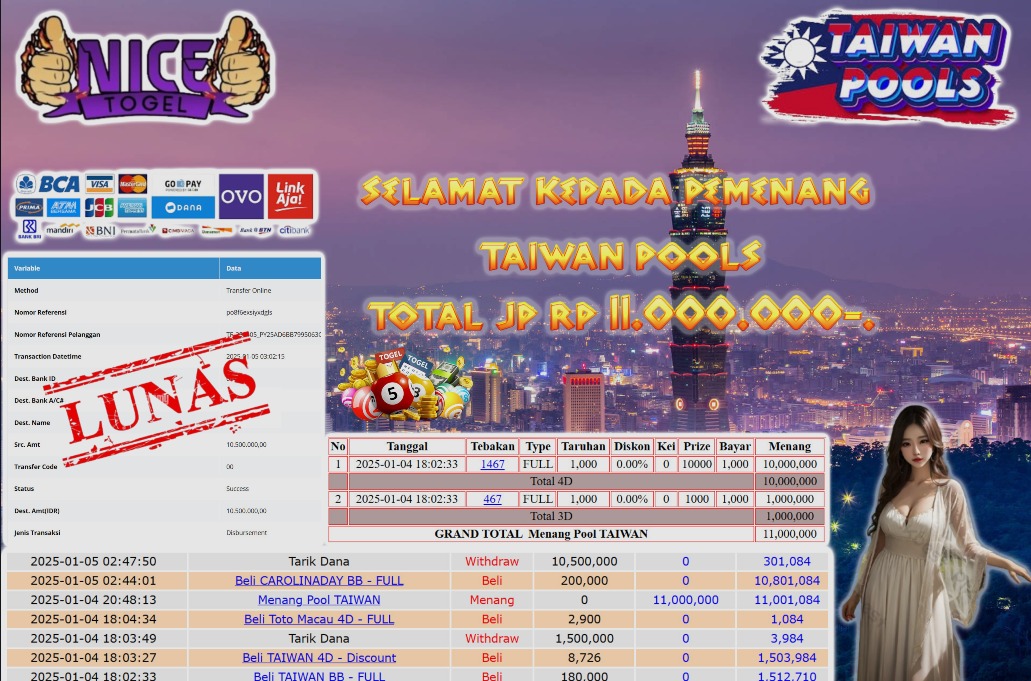 Selamat kepada User id : Jeje*** Telah berhasil mendapatkan kemenangan besar pada permainan TOGEL TAIWAN POOLS Dengan kemenangan Sebesar Rp.11.000.000,- Setelah mengisi formulir withdraw dengan kurung waktu hanya 5 – 10 menit pihak NICETOGEL sudah melakukan transfer kepada pemilik Userid dan dana sudah dapat di cairkan oleh pemenang. Bukti pembayaran yang kami berikan merupakan bukti pembayaran yang SAH / VALID yang langung di dapatkan melaui tanda transfer transaksi dari Bank yang di tuju.