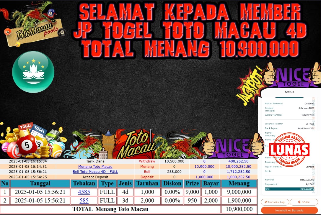 Selamat kepada User id : jar** Telah berhasil mendapatkan kemenangan besar pada permainan TOGEL TOTO MACAU 4D Dengan kemenangan Sebesar Rp10.900.000,- Setelah mengisi formulir withdraw dengan kurung waktu hanya 5 – 10 menit pihak NICETOGEL sudah melakukan transfer kepada pemilik Userid dan dana sudah dapat di cairkan oleh pemenang. Bukti pembayaran yang kami berikan merupakan bukti pembayaran yang SAH / VALID yang langung di dapatkan melaui tanda transfer transaksi dari Bank yang di tuju.