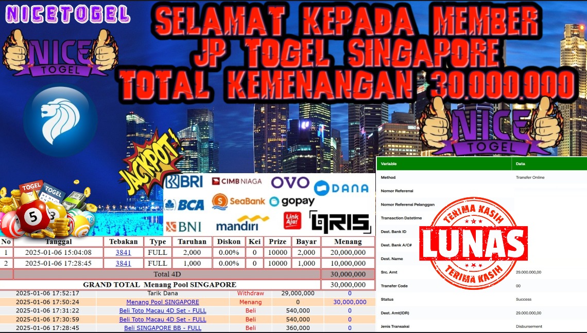 Selamat kepada User id : agus** Telah berhasil mendapatkan kemenangan besar pada permainan TOGEL SINGAPORE POOLS Dengan kemenangan Sebesar Rp.30.000.000,- Setelah mengisi formulir withdraw dengan kurung waktu hanya 5 – 10 menit pihak NICETOGEL sudah melakukan transfer kepada pemilik Userid dan dana sudah dapat di cairkan oleh pemenang. Bukti pembayaran yang kami berikan merupakan bukti pembayaran yang SAH / VALID yang langung di dapatkan melaui tanda transfer transaksi dari Bank yang di tuju.