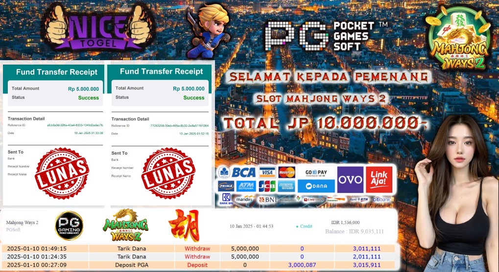 Selamat kepada User id : darr** Telah berhasil mendapatkan kemenangan besar pada permainan SLOT MAHJONG WAYS 2 Dengan kemenangan Sebesar Rp.10.000.000,- Setelah mengisi formulir withdraw dengan kurung waktu hanya 5 – 10 menit pihak NICETOGEL sudah melakukan transfer kepada pemilik Userid dan dana sudah dapat di cairkan oleh pemenang. Bukti pembayaran yang kami berikan merupakan bukti pembayaran yang SAH / VALID yang langung di dapatkan melaui tanda transfer transaksi dari Bank yang di tuju.
