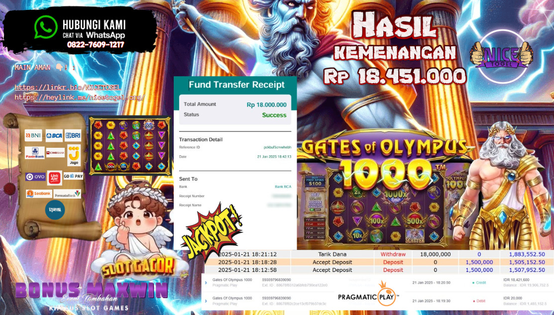 Selamat kepada User id : Tuti** Telah berhasil mendapatkan kemenangan besar pada permainan SLOT GATES OF OLYMPUS 1000 Dengan kemenangan Sebesar Rp.18.451.000,- Setelah mengisi formulir withdraw dengan kurung waktu hanya 5 – 10 menit pihak NICETOGEL sudah melakukan transfer kepada pemilik Userid dan dana sudah dapat di cairkan oleh pemenang. Bukti pembayaran yang kami berikan merupakan bukti pembayaran yang SAH / VALID yang langung di dapatkan melaui tanda transfer transaksi dari Bank yang di tuju.