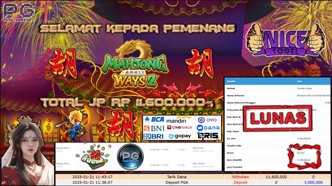 Selamat kepada User id : Teyua55** Telah berhasil mendapatkan kemenangan besar pada permainan SLOT MAHJONG WAYS 2 Dengan kemenangan Sebesar Rp.11.600.000,- Setelah mengisi formulir withdraw dengan kurung waktu hanya 5 – 10 menit pihak NICETOGEL sudah melakukan transfer kepada pemilik Userid dan dana sudah dapat di cairkan oleh pemenang. Bukti pembayaran yang kami berikan merupakan bukti pembayaran yang SAH / VALID yang langung di dapatkan melaui tanda transfer transaksi dari Bank yang di tuju.