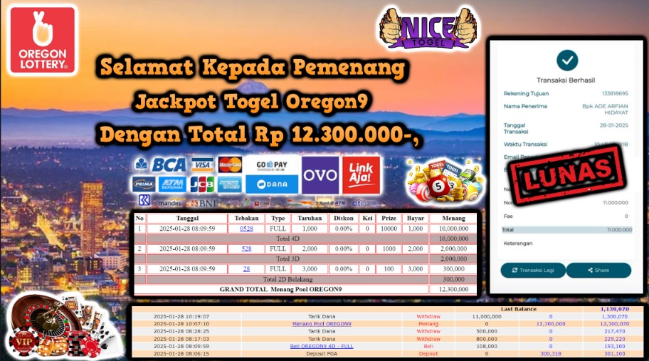 Selamat kepada User id : Yusu58** Telah berhasil mendapatkan kemenangan besar pada permainan TOGEL OREGON 9 Dengan kemenangan Sebesar Rp.12.300.000,- Setelah mengisi formulir withdraw dengan kurung waktu hanya 5 – 10 menit pihak NICETOGEL sudah melakukan transfer kepada pemilik Userid dan dana sudah dapat di cairkan oleh pemenang. Bukti pembayaran yang kami berikan merupakan bukti pembayaran yang SAH / VALID yang langung di dapatkan melaui tanda transfer transaksi dari Bank yang di tuju.