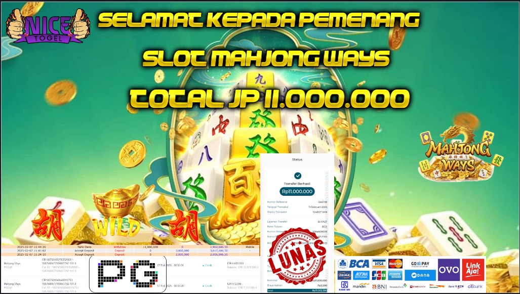 Selamat kepada User id : KAOI** Telah berhasil mendapatkan kemenangan besar pada permainan SLOT MAHJONG WAYS Dengan kemenangan Sebesar Rp.11.000.000,- Setelah mengisi formulir withdraw dengan kurung waktu hanya 5 – 10 menit pihak NICETOGEL sudah melakukan transfer kepada pemilik Userid dan dana sudah dapat di cairkan oleh pemenang. Bukti pembayaran yang kami berikan merupakan bukti pembayaran yang SAH / VALID yang langung di dapatkan melaui tanda transfer transaksi dari Bank yang di tuju.